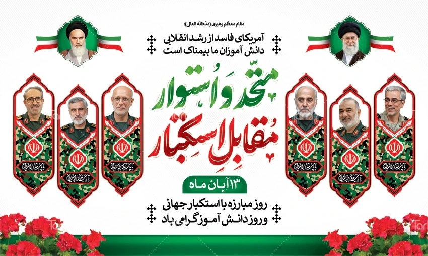 طرح بنر 13 آبان و سرداران شهید جنگ اسرائیل با خوشنویسی متحد و استوار مقابل استکبار کد فایل 9425617