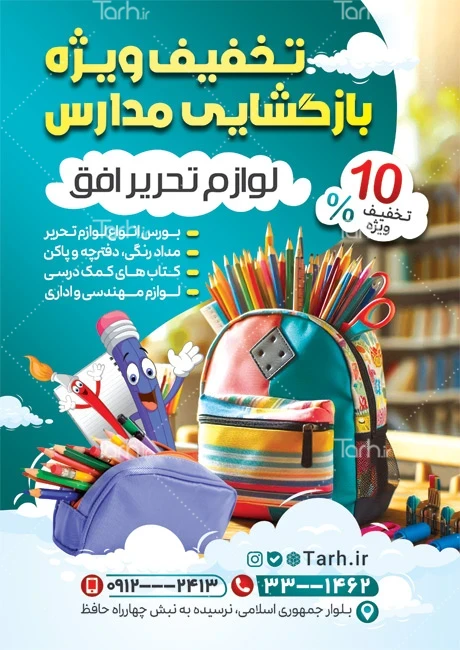 ابعاد طرح تراکت تبلیغاتی لوازم التحریر با تخفیف ویژه مدارس در جدول ویژگیهای فایل درجشده و با توجه به لایه باز بودن و کیفیت بالای طرح نوشت افزار، قابلیت ویرایش و تبدیل به سایز دلخواه، همچنین چاپ روی متریالهای مختلف مانند بنر، کاغذ، گلاسه و ... را دارا میباشد. برای مثال تراکت خام نوشت افزار مدارس در ابعاد A4 رزولوشن 300 dpi قابلیت چاپ بنر و لارج فرمت در ابعاد بزرگتر مانند 3 در 4 متر و بدون افت کیفیت را دارا میباشد. تراکت ها به عنوان یک ابزار تبلیغاتی بسیار موثر محسوب می شوند و به دلیل هزینه کم و تأثیر بالا، در بسیاری از کسب و کارها به عنوان روشی برای تبلیغات و رویدادهای مختلف مورد استفاده قرار می گیرند.
