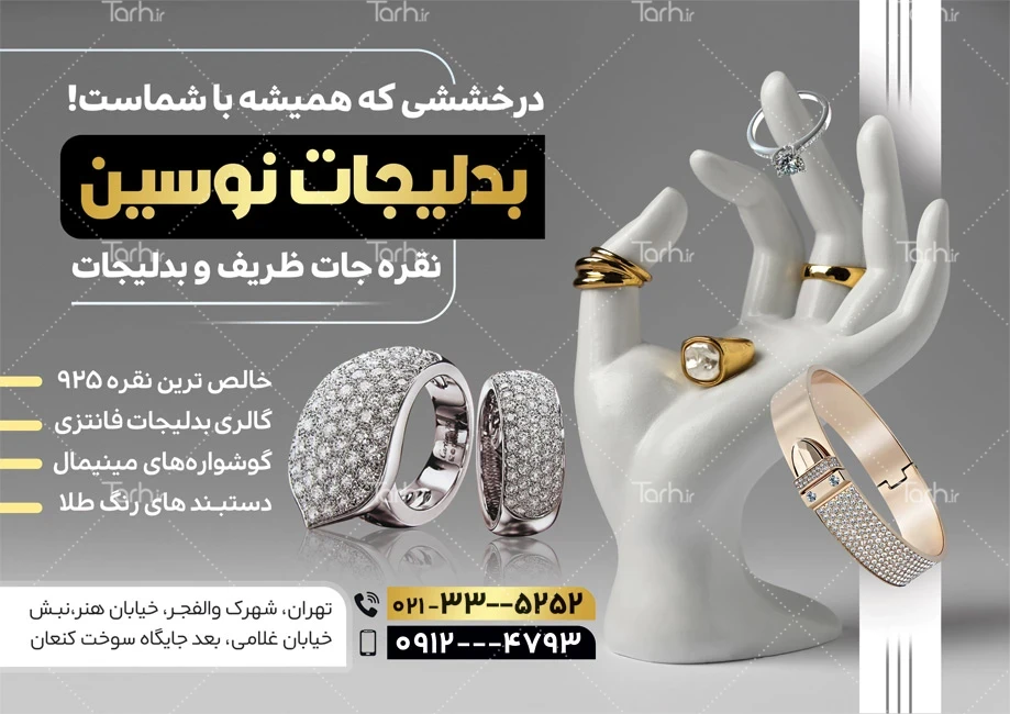 طرح لایه باز تراکت بدلیجات با فرمت psd و قابل ویرایش در نرمافزار فتوشاپ بهصورت لایه باز توسط تیم طراحان طرح دات آی آر طراحی شده است. در نمونه تراکت بدلیجات از تصاویر و المانهای باکیفیت و متناسب با استاندارد چاپ استفادهشده، همچنین نکات مهم در طرح خام تراکت جواهری مانند رنگبندی، رعایت حاشیه، فاصلهها، فضای کافی برای درج متن، سایز و نوع فونت مناسب طراحی تراکت و ... رعایت گردیده است. طرح لایه باز تراکت نقره و جواهرات شامل عکس انگشتر و دستبند و عکس گوشواره میباشد که المانهای استفادهشده در طرح تراکت بدلیجات قابلیت ویرایش، جابهجایی و تغییر سایز را دارا بوده و شما میتوانید متناسب باسلیقه خودتان طرح تراکت نقره فروشی را ویرایش نمایید، همچنین با تغییر تصاویر و متنها میتوانید طرح تراکت فروشگاه نقره را به طرح تراکت کسب و کار مد نظر خود شخصی سازی نمایید.