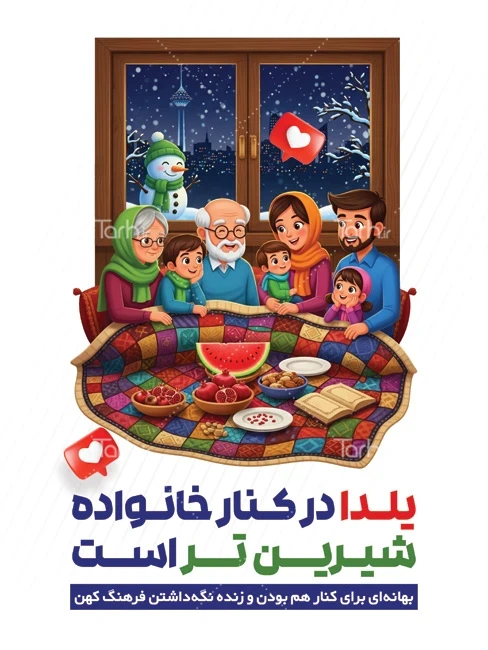 طرح بنر تبریک شب یلدا دارای تصویرسازی خانواده و سفره یلدایی کد فایل 9457081