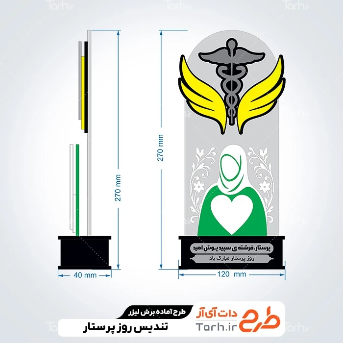 طرح آماده تندیس روز پرستار با نرم افزار Corel Draw به صورت لایه باز و قابل ویرایش توسط تیم طراحان طرح دات آی آر طراحی شده است. در طرح آماده برش لیزری استند روز پرستار نکات مهم طراحی لیزر مانند رعایت ضخامت چوب، ابعاد استاندارد طرح و چیدمان درست برای کمترین پرتی رعایت گردیده است. طرح تندیس روز پرستار و میلاد حضرت زینب، آماده اجرا توسط دستگاه های برش، سی ان سی (CNC)، حکاکی لیزر و حکاکی روی چوب میباشد. شما میتوانید از طرح لیزر پرستار جهت تولید انواع تندیس و استند روز پرستار به عنوان هدیه در مراسمات روز پرستار و ولادت حضرت زینب استفاده کنید.