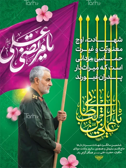 طرح پوستر ولادت امام علی و سالگرد حاج قاسم با فرمت psd و قابل ویرایش در نرم افزار فتوشاپ به صورت لایه باز توسط تیم طراحان طرح دات آی آر طراحی شده است. در طرح بنر سالگرد سردار سلیمانی و ولادت امام علی از تصاویر و المان های با کیفیت و متناسب با استاندارد چاپ استفاده گردیده است. طرح بنر سالگرد سردار و ولادت حضرت علی شامل تایپوگرافی یا مرتضی علی، عکس سردار سلیمانی، وکتور گل میباشد که المان های استفاده شده در بنر سالگرد حاج قاسم سلیمانی و ولادت امام علی قابلیت ویرایش، جابه جایی و تغییر سایز را دارا بوده و شما می توانید متناسب با سلیقه خودتان بنر لایه باز سردار سلیمانی و ولادت امام علی را ویرایش نمایید.
