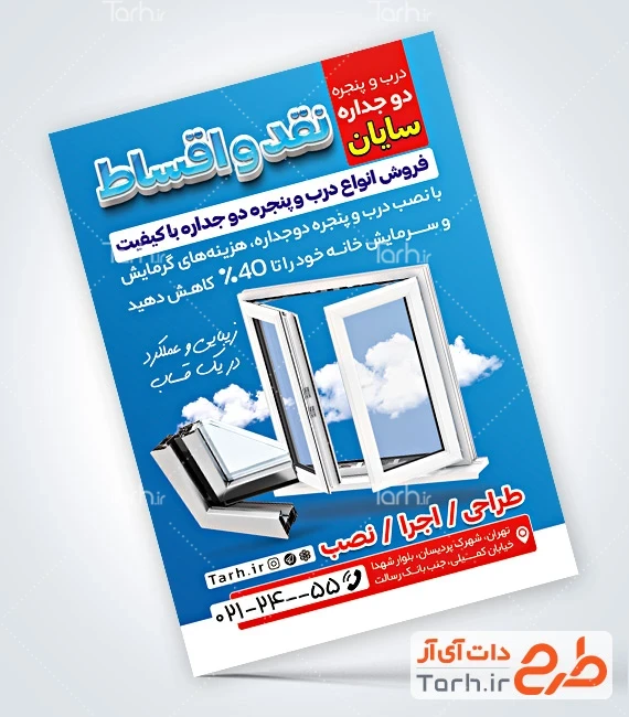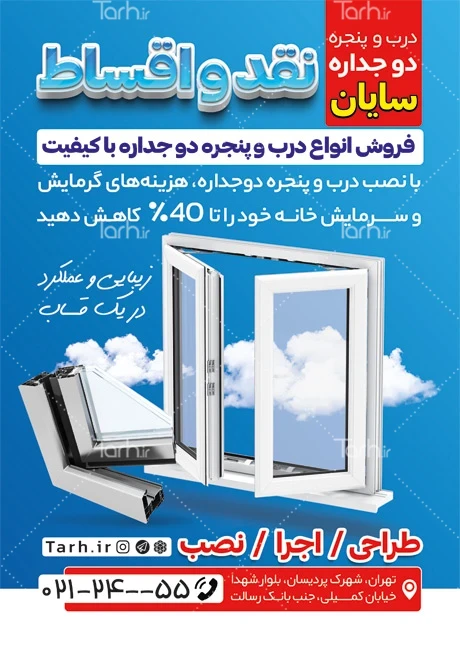 طرح لایه باز تراکت پنجره دوجداره با بکگراند آبی کد فایل 9472360