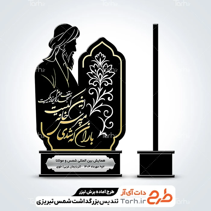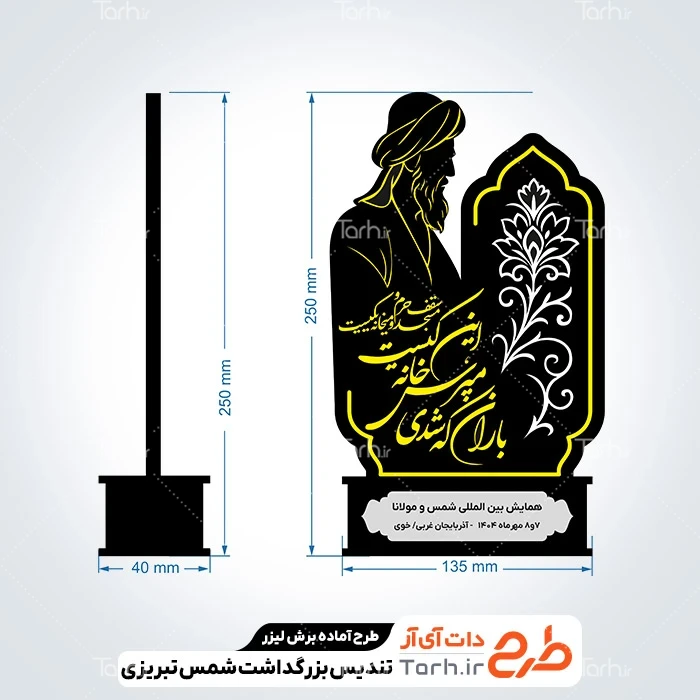 طرح لایه باز لیزر تندیس بزرگداشت شمس تبریزی با نرم افزار Corel Draw به صورت لایه باز و قابل ویرایش توسط تیم طراحان طرح دات آی آر طراحی شده است. در طرح آماده برش لیزری استند روز شمس تبریزی نکات مهم طراحی لیزر مانند رعایت ضخامت چوب، ابعاد روز شمس تبریزی طرح و چیدمان درست برای کمترین پرتی رعایت گردیده است. طرح برش لیزری تندیس بزرگداشت شمس تبریزی، آماده اجرا توسط دستگاه های برش، سی ان سی (CNC)، حکاکی لیزر و حکاکی روی چوب میباشد. شما میتوانید از طرح لیزر روز شمس تبریزی جهت تولید انواع تندیس و استند بزرگداشت شمس تبریزی به عنوان هدیه در مناسبت روز شمس تبریزی استفاده کنید.