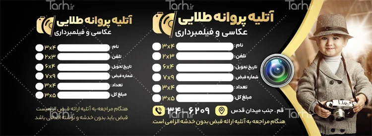طرح لایه باز رسید آتلیه عکاسی با رنگ بندی مشکی طلایی کد فایل 9528306