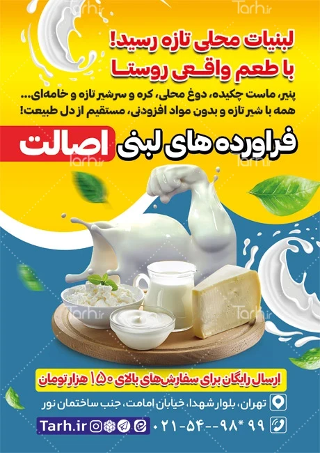 طرح آماده تراکت لبنیاتی با فرمت psd و قابل ویرایش در نرمافزار فتوشاپ بهصورت لایه باز توسط تیم طراحان طرح دات آی آر طراحی شده است. در نمونه تراکت لبنیاتی از تصاویر و المانهای باکیفیت و متناسب با استاندارد چاپ استفادهشده، همچنین نکات مهم در طرح تراکت لبنیاتی مانند رنگبندی، رعایت حاشیه، فاصلهها، فضای کافی برای درج متن، سایز و نوع فونت مناسب طراحی تراکت و ... رعایت گردیده است. طرح لایه باز تراکت فروشگاه لبنیات شامل عکس پنیر، ماست، لیوان شیر، تخم مرغ و متن تبلیغاتی سوپر لبنیات میباشد که المانهای استفادهشده در طرح تراکت فروشگاه لبنیات قابلیت ویرایش، جابهجایی و تغییر سایز را دارا بوده و شما میتوانید متناسب باسلیقه خودتان تراکت لایه باز لبنیاتی را ویرایش نمایید، همچنین با تغییر تصاویر و متنها میتوانید طرح تراکت سوپرلبنیات را به طرح تراکت کسب و کار مد نظر خود شخصی سازی نمایید.