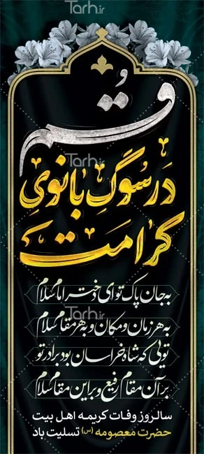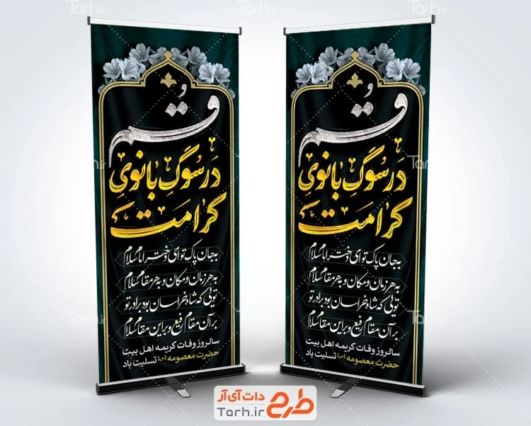 بنر استندی وفات حضرت معصومه با فرمت psd و قابل ویرایش در نرم افزار فتوشاپ به صورت لایه باز توسط تیم طراحان طرح دات آی آر طراحی شده است. در طرح لایه باز استند رحلت حضرت معصومه از تصاویر و المان های با کیفیت و متناسب با استاندارد چاپ استفاده گردیده است. طرح بنر ایستاده رحلت حضرت معصومه شامل تایپوگرافی قم در سوگ بانوی کرامت، متن تسلیت وفات حضرت معصومه و وکتور گل می باشد که المان های استفاده شده در بنر خام رحلت حضرت معصومه قابلیت ویرایش، جابه جایی و تغییر سایز را دارا بوده و شما می توانید متناسب با سلیقه خودتان طرح بنر رحلت حضرت معصومه را ویرایش نمایید.