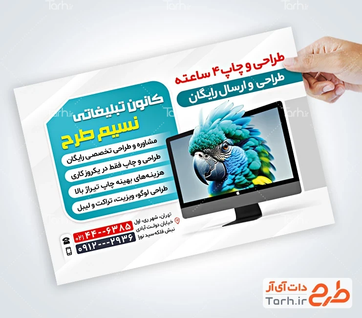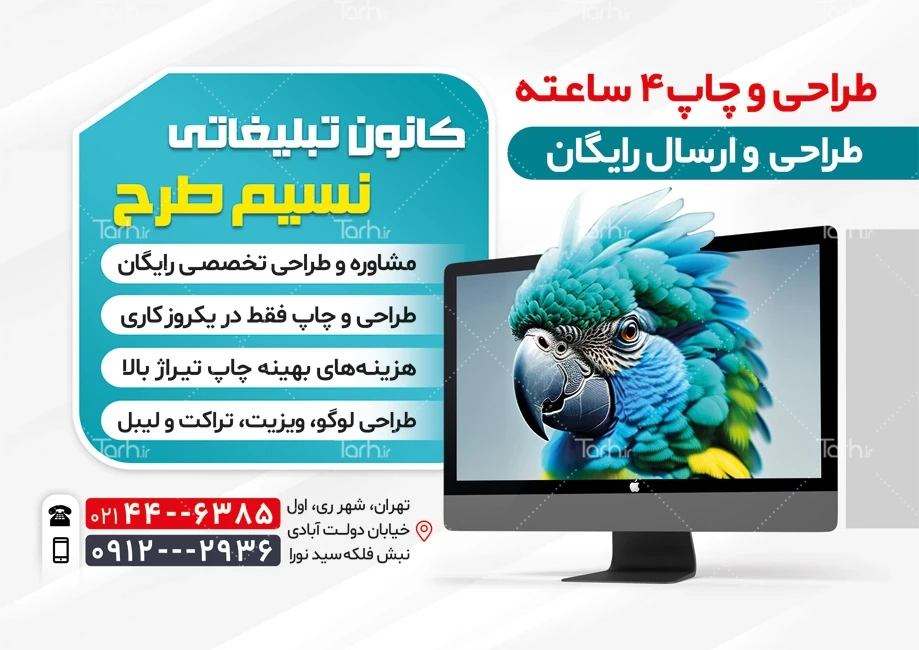 تراکت لایه باز کانون تبلیغاتی با فرمت psd و قابل ویرایش در نرمافزار فتوشاپ بهصورت لایه باز توسط تیم طراحان طرح دات آی آر طراحی شده است. در نمونه تراکت کانون تبلیغات از تصاویر و المانهای باکیفیت و متناسب با استاندارد چاپ استفادهشده، همچنین نکات مهم در طرح تراکت کانون تبلیغات مانند رنگبندی، رعایت حاشیه، فاصلهها، فضای کافی برای درج متن، سایز و نوع فونت مناسب طراحی تراکت و ... رعایت گردیده است. طرح لایه باز تراکت کانون آگهی و تبلیغات شامل عکس طوطی میباشد که المانهای استفادهشده در طرح تراکت کانون تبلیغات قابلیت ویرایش، جابهجایی و تغییر سایز را دارا بوده و شما میتوانید متناسب باسلیقه خودتان تراکت لایه باز شرکت تبلیغاتی را ویرایش نمایید، همچنین با تغییر تصاویر و متنها میتوانید طرح تراکت کانون آگهی را به طرح تراکت کسب و کار مد نظر خود شخصی سازی نمایید.