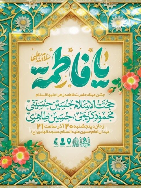 طرح بنر اطلاع رسانی ولادت حضرت فاطمه با تایپوگرافی یا فاطمه کد فایل 9605384