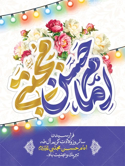 طرح بنر تبریک ولادت امام حسن با فرمت psd و قابل ویرایش در نرم افزار فتوشاپ به صورت لایه باز توسط تیم طراحان طرح دات آی آر طراحی شده است. در طرح پوستر ولادت امام حسن از تصاویر و المان های با کیفیت و متناسب با استاندارد چاپ استفاده گردیده است. طرح لایه باز بنر ولادت امام حسن شامل تایپوگرافی امام حسن مجتبی، وکتور چراغانی و گل می باشد که المان های استفاده شده در پوستر لایه باز ولادت امام حسن قابلیت ویرایش، جابه جایی و تغییر سایز را دارا بوده و شما می توانید متناسب با سلیقه خودتان طرح لایه باز ولادت امام حسن مجتبی را ویرایش نمایید.