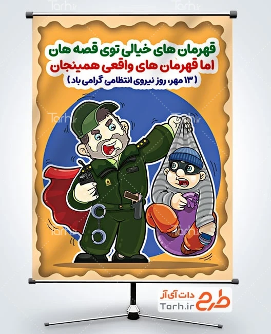 طرح لایه باز پوستر هفته انتظامی با فرمت psd و قابل ویرایش در نرم افزار فتوشاپ به صورت لایه باز توسط تیم طراحان طرح دات آی آر طراحی شده است. در طرح پوستر هفته انتظامی از تصاویر و المانهای با کیفیت و متناسب با استاندارد چاپ استفاده گردیده است. طرح لایه باز تبریک روز نیروی انتظامی شامل تصویرسازی پلیس و دزد می باشد. المانهای استفاده شده در طرح بنر روز نیروی انتظامی قابلیت ویرایش، جابه جایی و تغییر سایز را دارا بوده و شما می توانید متناسب با سلیقه خودتان بنر لایه باز هفته انتظامی را ویرایش نمایید.