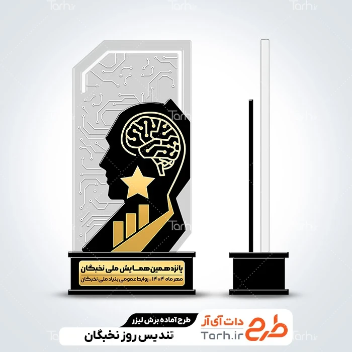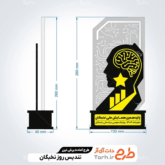 فایل لیزر تندیس روز نخبگان با نرم افزار Corel Draw به صورت لایه باز و قابل ویرایش توسط تیم طراحان طرح دات آی آر طراحی شده است. در طرح تندیس لیزری همایش ملی نخبگان نکات مهم طراحی لیزر مانند رعایت ضخامت چوب، ابعاد فایل برش لیزر تندیس روز نخبگان، طرح و چیدمان درست برای کمترین پرتی رعایت گردیده است. طرح برش لیزری تندیس جشنواره نخبگان، آماده اجرا توسط دستگاه های برش، سی ان سی (CNC)، حکاکی لیزر و حکاکی روی چوب میباشد. شما میتوانید از طرح تندیس روز نخبگان مدل طرح لیزر تندیس المپیاد علمی نخبگان جهت تولید انواع تندیس المپیاد به عنوان هدیه همایش ملی نخبگان استفاده کنید.