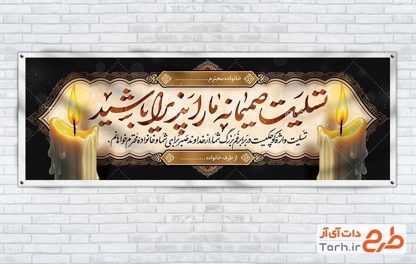 طرح قابل ویرایش بنر تسلیت با فرمت psd و قابل ویرایش در نرم افزار فتوشاپ به صورت لایه باز توسط تیم طراحان طرح دات آی آر طراحی شده است. در طرح لایه باز بنر تسلیت از تصاویر و المان های با کیفیت و متناسب با استاندارد چاپ استفاده گردیده است. طرح بنر تسلیت شامل خوشنویسی تسلیت صمیمانه ما را پذیرا باشید، طرح اسلیمی و وکتور شمع می باشد که المان های استفاده شده در بنر لایه باز تسلیت قابلیت ویرایش، جابه جایی و تغییر سایز را دارا بوده و شما می توانید متناسب با سلیقه خودتان طرح عرض تسلیت را ویرایش نمایید.