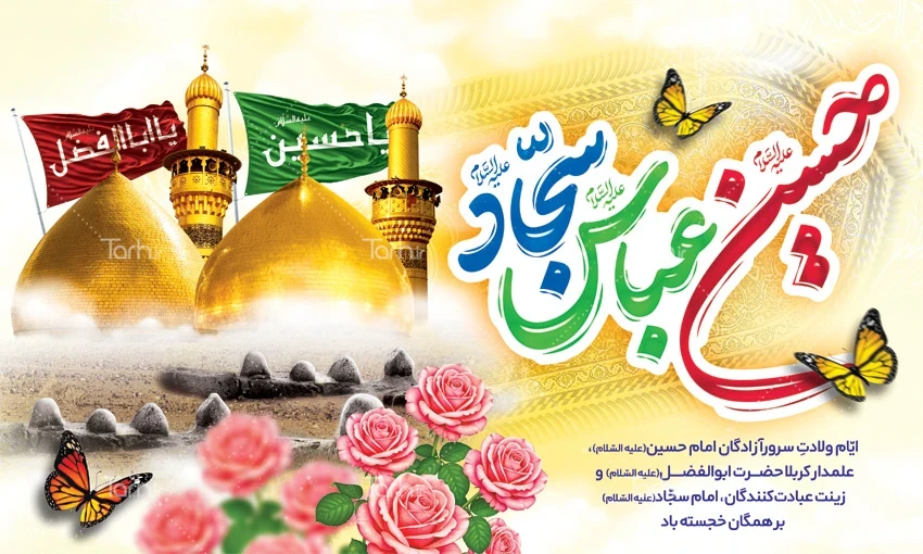 طرح بنر پشت مداح اعیاد شعبانیه با عکس گنبد و گلدسته حرم امام حسین و حضرت عباس کد فایل 9760523