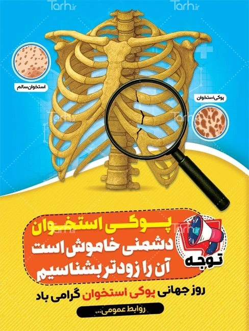پوستر روز پوکی استخوان لایه باز با فرمت psd و قابل ویرایش در نرم افزار فتوشاپ به صورت لایه باز توسط تیم طراحان طرح دات آی آر طراحی شده است. در بنر خام تبریک روز پوکی استخوان از تصاویر و المان های با کیفیت و متناسب با استاندارد چاپ استفاده گردیده است. پوستر روز جهانی پوکی استخوان شامل متن متن پوکی استخوان دسمن خاموش است آن را زودتر بشناسیم و عکس ستون فقرات می باشد که المان های استفاده شده در طرح لایه باز بنر روز پوکی استخوان قابلیت ویرایش، جابه جایی و تغییر سایز را دارا بوده و شما می توانید متناسب با سلیقه خودتان طرح روز جهانی پوکی استخوان را ویرایش نمایید.