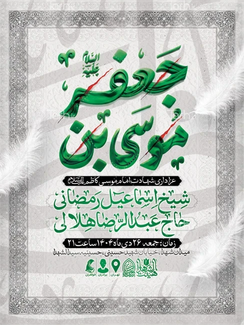 طرح پوستر اطلاع رسانی مراسم عزاداری شهادت امام کاظم با تایپوگرافی موسی بن جعفر کد فایل 9782356