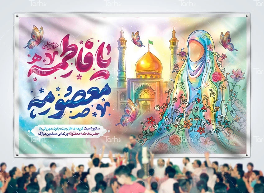 طرح بنر جایگاه ولادت حضرت معصومه با فرمت psd و قابل ویرایش در نرم افزار فتوشاپ به صورت لایه باز توسط تیم طراحان طرح دات آی آر طراحی شده است. در طرح بنر میلاد حضرت معصومه از تصاویر و المان های با کیفیت و متناسب با استاندارد چاپ استفاده گردیده است. بنر لایه باز جایگاه میلاد حضرت معصومه شامل خوشنویسی یا فاطمه معصومه و تصویرسازی زن و بارگاه حضرت معصومه می باشد که المان های استفاده شده در بنر لایه باز ولادت حضرت معصومه قابلیت ویرایش، جابه جایی و تغییر سایز را دارا بوده و شما می توانید متناسب با سلیقه خودتان طرح دکور ولادت حضرت معصومه را ویرایش نمایید.