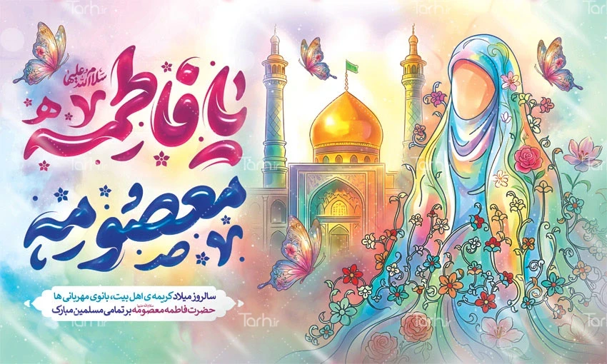 طرح بنر جایگاه ولادت حضرت معصومه با خوشنویسی یا فاطمه معصومه کد فایل 9783140
