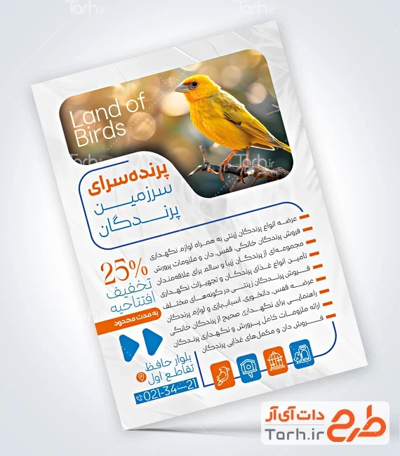طرح تراکت لایه باز پرنده سرا دارای عکس پرنده زینتی کد فایل 9784361