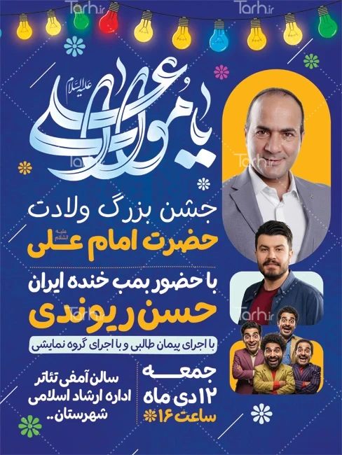 طرح بنر خام اطلاعیه جشن میلاد امام علی با فرمت psd و قابل ویرایش در نرم افزار فتوشاپ به صورت لایه باز توسط تیم طراحان طرح دات آی آر طراحی شده است. در پوستر ولادت حضرت علی از تصاویر و المان های با کیفیت و متناسب با استاندارد چاپ استفاده گردیده است. پوستر ولادت حضرت امیر شامل تایپوگرافی یا مولاعلی و وکتور چراغانی میباشد که المان های استفاده شده در بنر لایه باز اطلاعیه ولادت حضرت علی قابلیت ویرایش، جابه جایی و تغییر سایز را دارا بوده و شما می توانید متناسب با سلیقه خودتان طرح بنر ولادت حضرت علی را ویرایش نمایید.