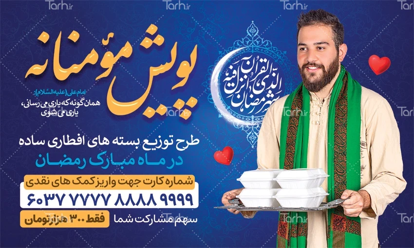 طرح لایه باز بنر پویش مومنانه با فرمت psd و قابل ویرایش در نرم افزار فتوشاپ به صورت لایه باز توسط تیم طراحان طرح دات آی آر طراحی شده است. در بنر کمک خیریه در ماه رمضان از تصاویر و المان های با کیفیت و متناسب با استاندارد چاپ استفاده گردیده است. بنر لایه باز اطعام در ماه رمضان شامل خوشنویسی پویش مومنانه با عکس ظرف غذا و عکس هلال ماه میباشد که المان های استفاده شده در بنر اطعام نیازمندان در ماه رمضان قابلیت ویرایش، جابه جایی و تغییر سایز را دارا بوده و شما می توانید متناسب با سلیقه خودتان طرح بنر رزمایش کمک مومنانه رمضان را ویرایش نمایید.
