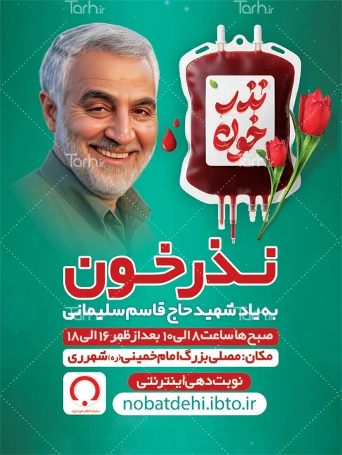 طرح بنر خام نذر خون به نیت سردار سلیمانی دارای عکس حاج قاسم سلیمانی کد فایل 9860514
