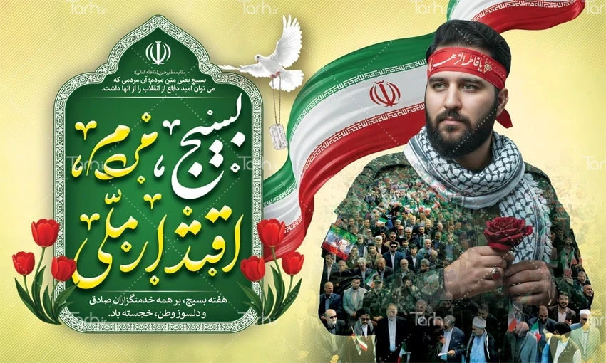 دانلود بنر هفته بسیج با تایپوگرافی شعار بسیج، مردم، اقتدار ملی کد فایل 9870561