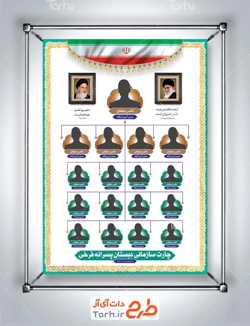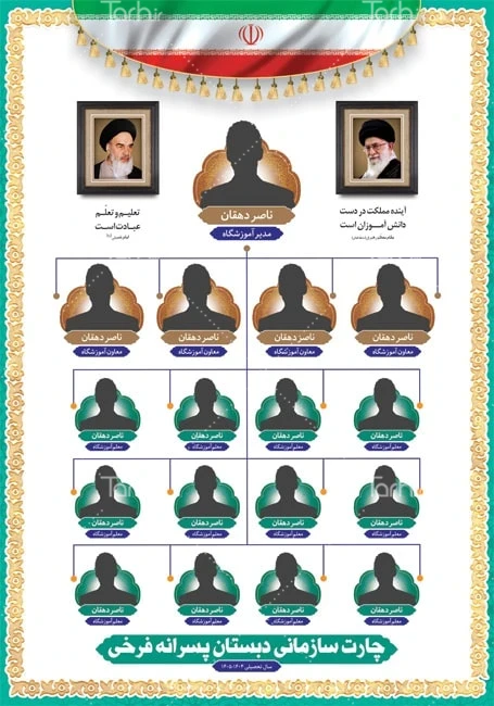 طرح بنر خام چارت سازمانی مدرسه با فرمت psd و قابل ویرایش در نرم افزار فتوشاپ به صورت لایه باز توسط تیم طراحان طرح دات آی آر طراحی شده است. در طرح لایه باز چارت مدرسه از تصاویر و المان های با کیفیت و متناسب با استاندارد چاپ استفاده گردیده است. بنر چارت سازمانی مدرسه لایه باز شامل چارت تشکیلاتی مدارس، عکس قاب عکس امام خمینی و رهبری و وکتور پرچم ایران می باشد که المان های استفاده شده در بنر لایه باز چارت سازمانی مدرسه قابلیت ویرایش، جابه جایی و تغییر سایز را دارا بوده و شما می توانید متناسب با سلیقه خودتان طرح چارت سازمانی مدرسه را ویرایش نمایید.