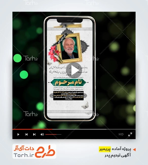 پروژه پریمیر اینستاگرام اعلامیه ترحیم پدر با کیفیت HD و با نرم افزار پریمیر پرو (Adobe Premiere Pro 2022) توسط تیم طراحان طرح دات آی آر طراحی شده است. قالب پریمیر اعلامیه ترحیم پدر با فرمت PRPROJ و قابل ویرایش در نرم افزار پریمیر پرو می باشد که یک فایل ویرایشی با پسوند psd به همراه آن است. طبق آموزش ارائه شده استفاده از این پروژه بسیار ساده و آسان است، شما میتوانید پروژه پریمیر آگهی ترحیم پدر را با استفاده از فایل پی اس دی به راحتی و بدون داشتن دانشی در مورد پریمیر ویرایش کنید و در عرض چند دقیقه طرح مد نظر را شخصی سازی کرده و خروجی mp4 را از طریق پریمیر دریافت نمایید.قالب پریمیر آگهی ترحیم پدر یک قالب ویدیویی آماده با زمان 19 ثانیه می باشد. در پروژه ریلز اینستاگرام اعلامیه ترحیم پدر از تصاویر و المان های با کیفیت استفاده گردیده است، تمام المان های استفاده شده در پروژه آماده پریمیر اینستاگرام اعلامیه مراسم ترحیم پدر قابلیت ویرایش، جابه جایی و تغییر سایز را دارا بوده و شما می توانید متناسب با سلیقه خودتان پروژه تیزر اینستاگرام آگهی ترحیم پدر را ویرایش نمایید و با بهترین کیفیت خروجی بگیرید.
